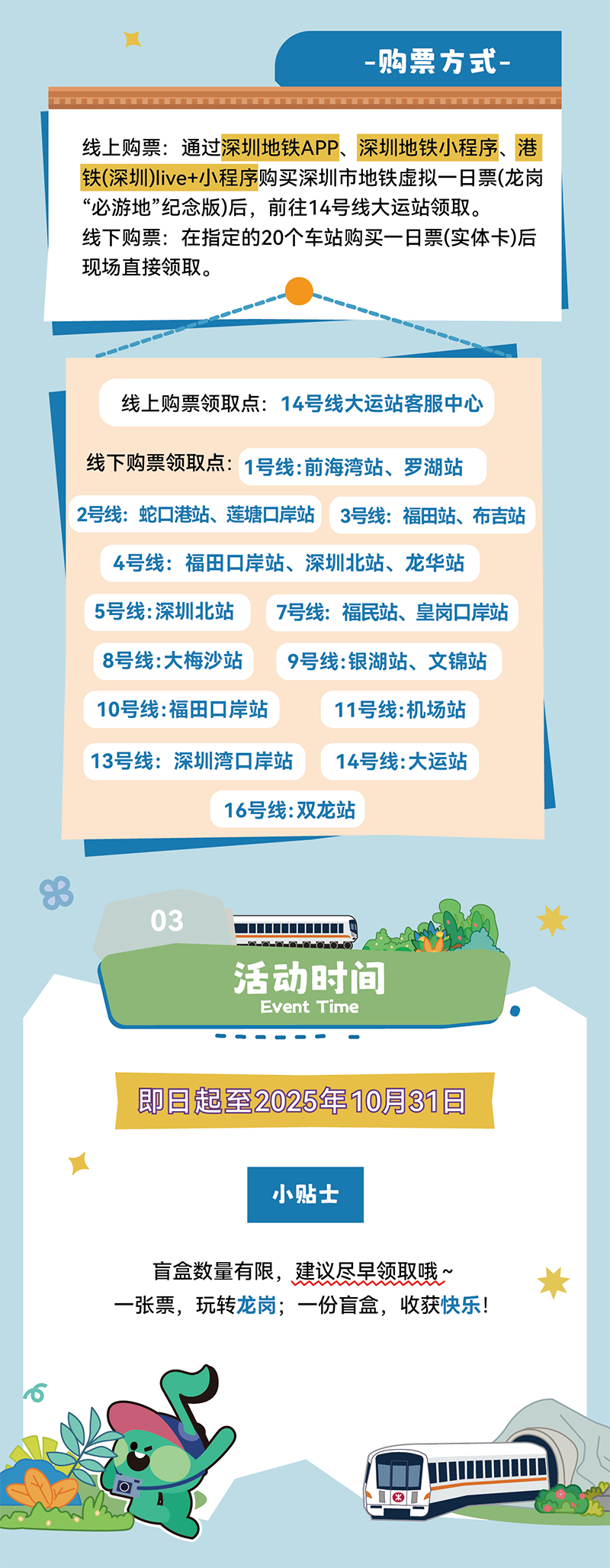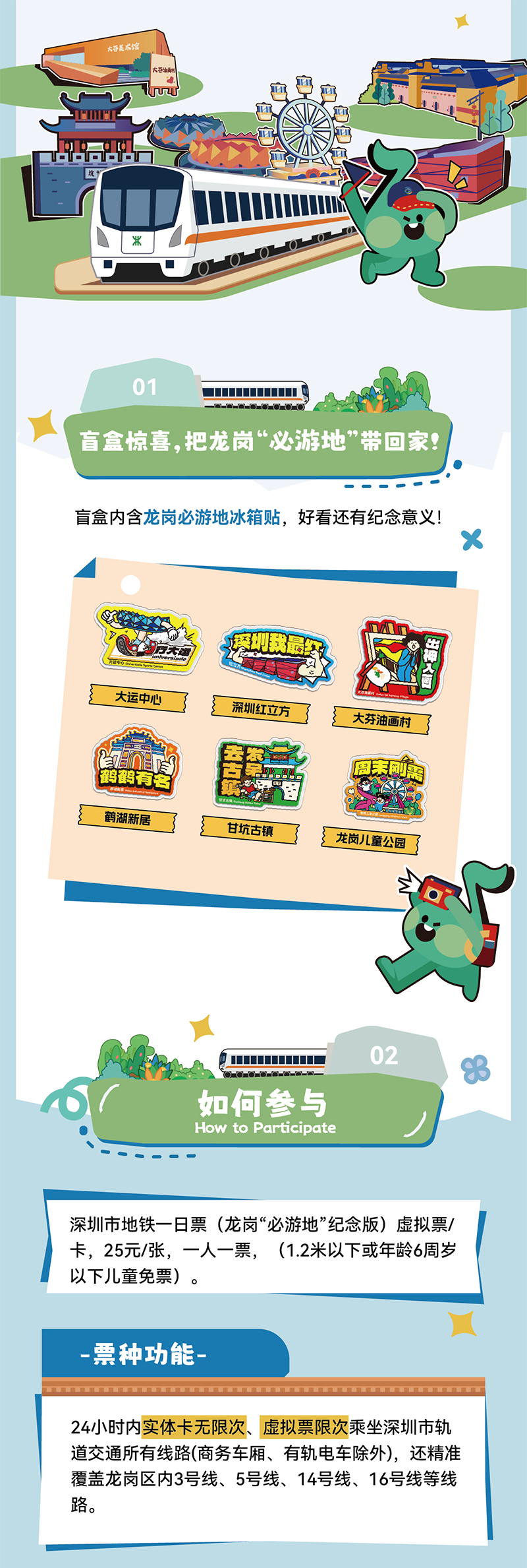 1.线上购买深圳市地铁虚拟一日票(龙岗“必游地”纪念版)的朋友,请前往14号线大运站领取。