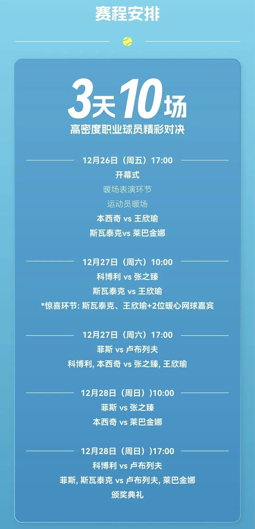 另外比赛期间还会有时尚红毯秀、直播大盛典等嘉年华场景,世界球星和娱乐明星在此会聚一堂,为中国网球迷们贡献一场无与伦比的视觉盛宴,这将是在中国本土举办的网球全明星跨年大聚会!